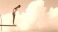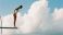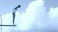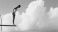 • Woman in White Swimsuit on Diving Board Against Cloudy Sky