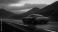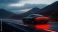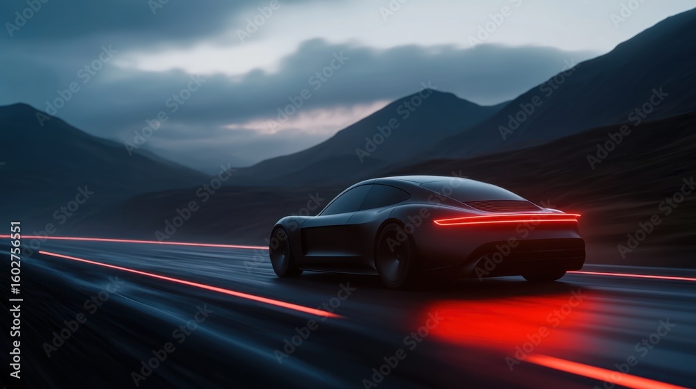 • Futuristic electric sports car on mountain highway at dusk
