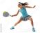 • Side view of an athletic female padel player in skirt lunging to hit the ball mid-game