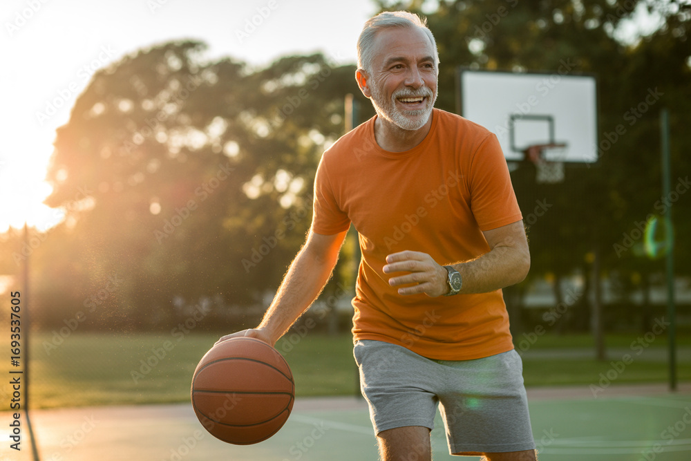 Plakat do Fitness Clubu - Active senior man happily playing basketball on an outdoor court #1693537605