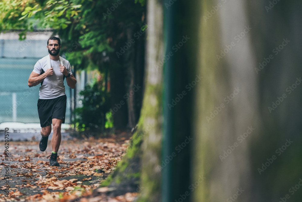 Plakat do Fitness Clubu - Determined young man running outside in the park. Fit boy doing exercise outdoor. Beautiful... #1696207570