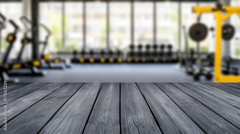 Plakat do Fitness Clubu - Dark gray wooden table in front of gym background #1706720957