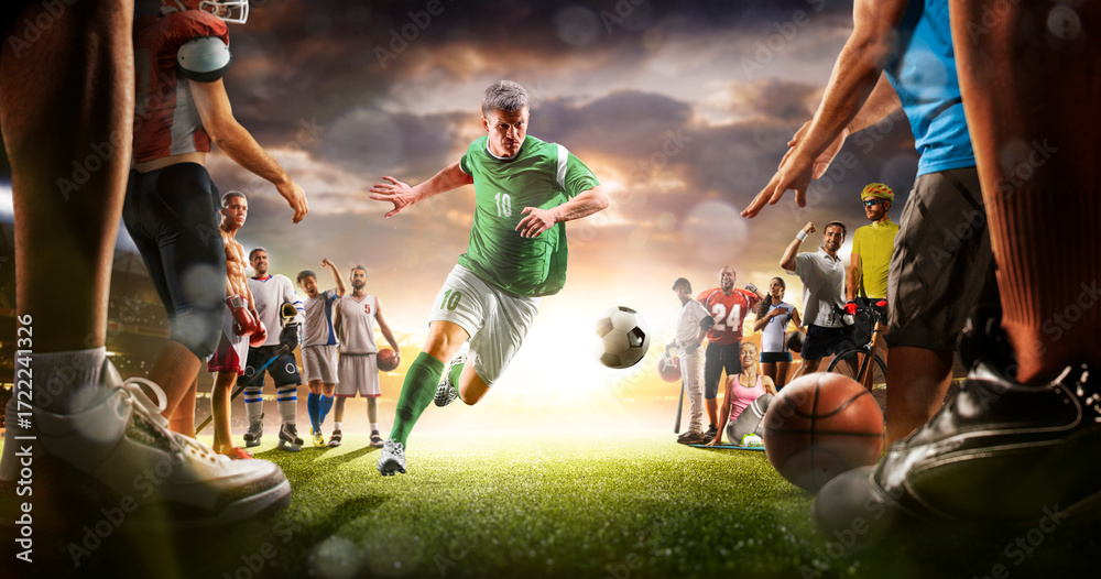 • The multi sports collage including boxing, ice hockey, basketball, cycling, soccer, american football, fitnes, gym, baseball, volleyball with soccer player in the main role on the grand arena