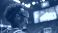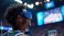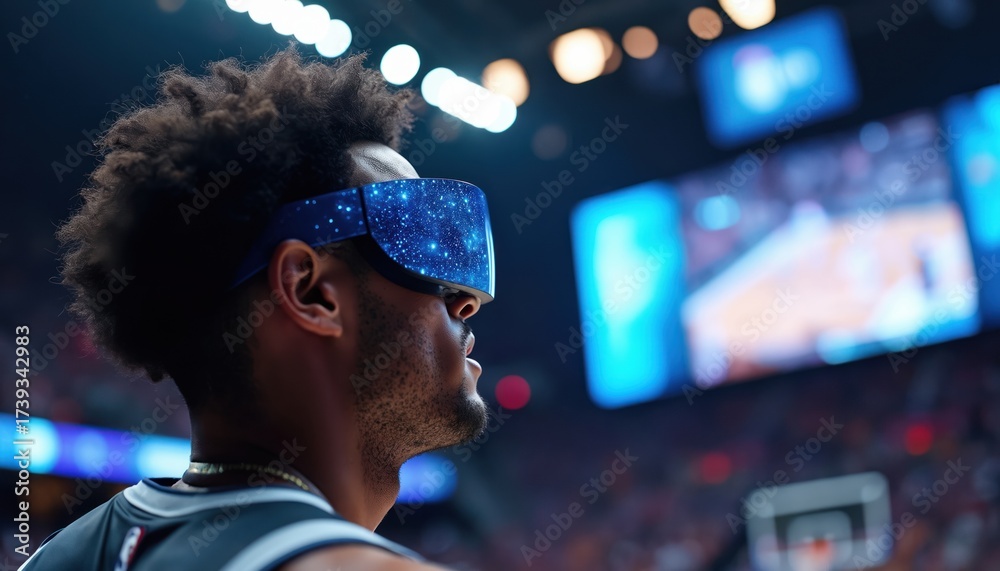 • Man wears virtual reality goggles watching basketball game in stadium. Futuristic arena displays game on big screens. Athlete explores sports tech future.