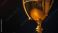 • Close-up of a golden trophy with polished metal reflecting warm spotlight, standing out against darkness.