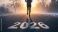 • A lone person jogs on a dark asphalt road marked with the year 2026, heading into a warm, foggy sunrise over a winter landscape.