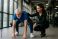• Senior man doing stretching exercise with female personal trainer guiding him in modern gym with large windows.