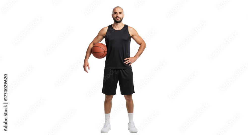 Plakat do Fitness Clubu - Full body portrait of a basketball player standing confidently holding ball #1774029620