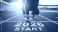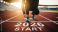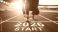 • Athlete tying shoelaces at start line with 2026 goal, golden hour stadium