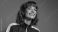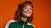 • a portrait of an elegant woman with shoulder-length wavy red hair, bangs, and wearing a green and white sports tracksuit, laughing while standing in front of an orange background