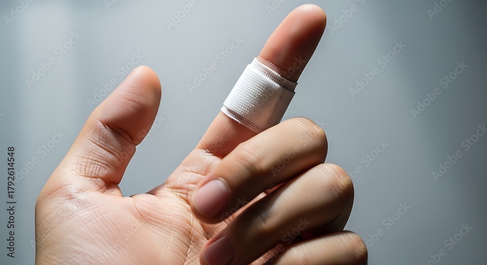 • Quickly healing finger sports a fresh bandage, showing a small injury needing immediate care and recovery