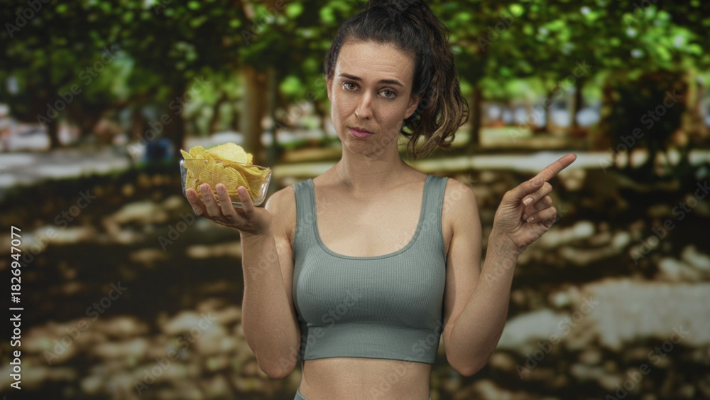 Plakat do Fitness Clubu - Woman in gray sports bra points finger at bowl of crispy chips in green forest; hesitation craving. #1826947077