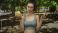 • Woman in gray sports bra points finger at bowl of crispy chips in green forest; hesitation craving.