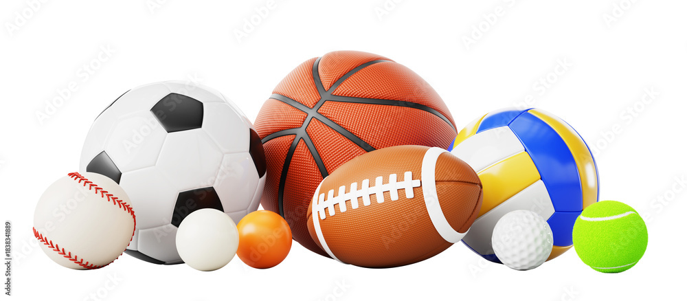 • 3d pile of sports balls isolated on white background. American football, golf, soccer, basketball, volleyball, handball, rugby, baseball softball, ping pong and tennis game equipment