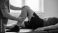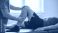 Physical therapy and sports injury rehabilitation. Medical healthcare and recovery. Doctor in blue scrubs performing a knee joint mobility exercise on a patient in a clinic.