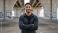 • Confident young athletic man smiling at the camera with arms crossed. Portrait of a happy male in an urban city setting under a bridge