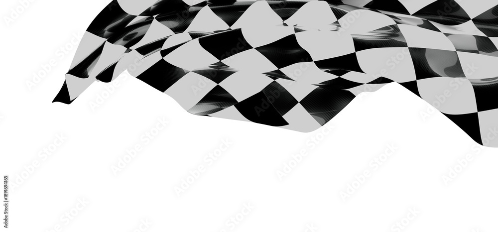 • A close-up shot of a waving checkered flag, isolated against a bright white backdrop. Represents victory, competition, a