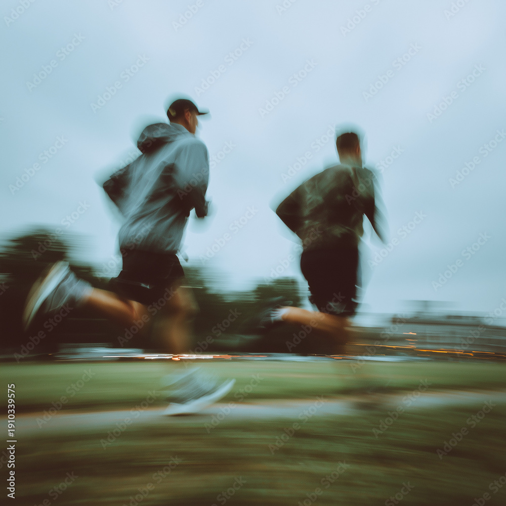 Plakat do Fitness Clubu - Two athletic men run fast outdoors with motion blur under overcast sky #1910339575