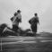 • Two athletic men run fast outdoors with motion blur under overcast sky
