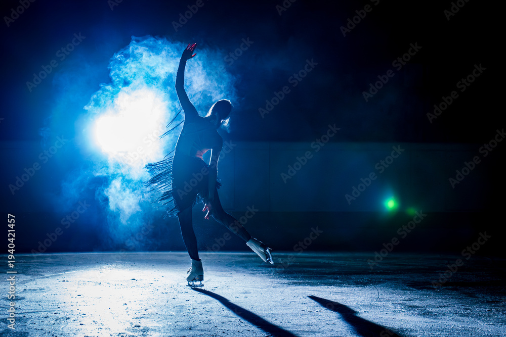 • Silhouette of a figure skater performing on a dark indoor ice rink with bright blue backlight and mist. Dramatic winter sports scene with elegant pose, motion and theatrical atmosphere.