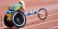 • Wheelchair racing athlete accelerating on stadium track. Speed, power, determination in paralympic athletics. Motion blur. Grain and texture of 35mm film scan.
