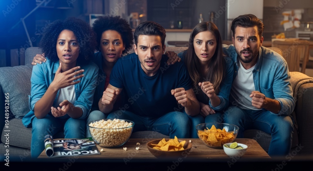 • Group of friends watching football match on television at home. Excited team of men and woman cheering during live sport game. Casual leisure activity with snacks in living room setting.