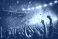 Silhouette of a figure skater performing on a dark indoor ice rink with bright blue backlight and mist. Dramatic winter sports scene with elegant pose, motion and theatrical atmosphere.