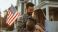 • A veteran serviceman in uniform embracing his family on the front porch of their home, with an American flag waving proudly nearby, capturing the warmth of homecoming.