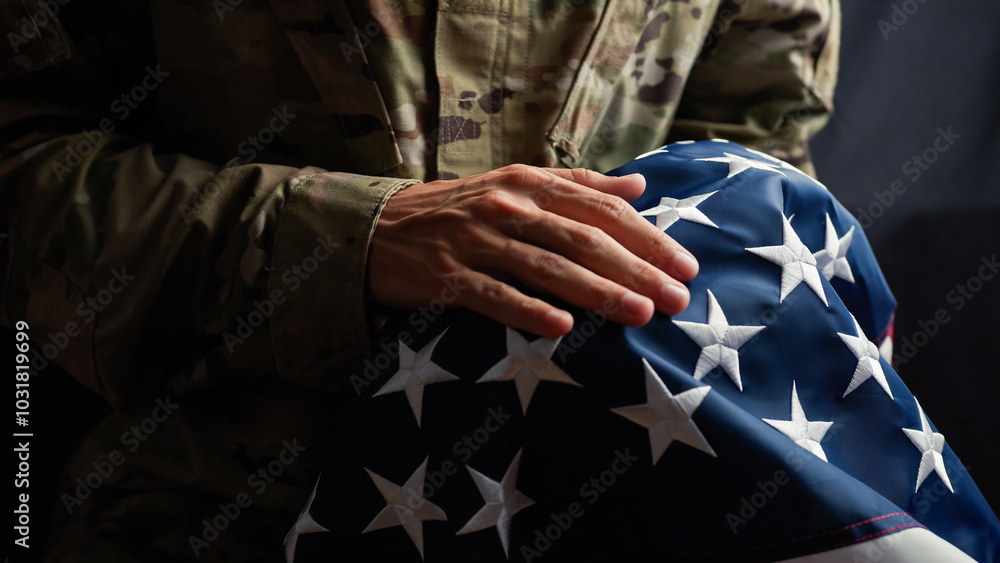 Plakat do Gabinetu Weterynaryjnego - Soldier caressing the stars of a usa Flag on veterans day #1031819699