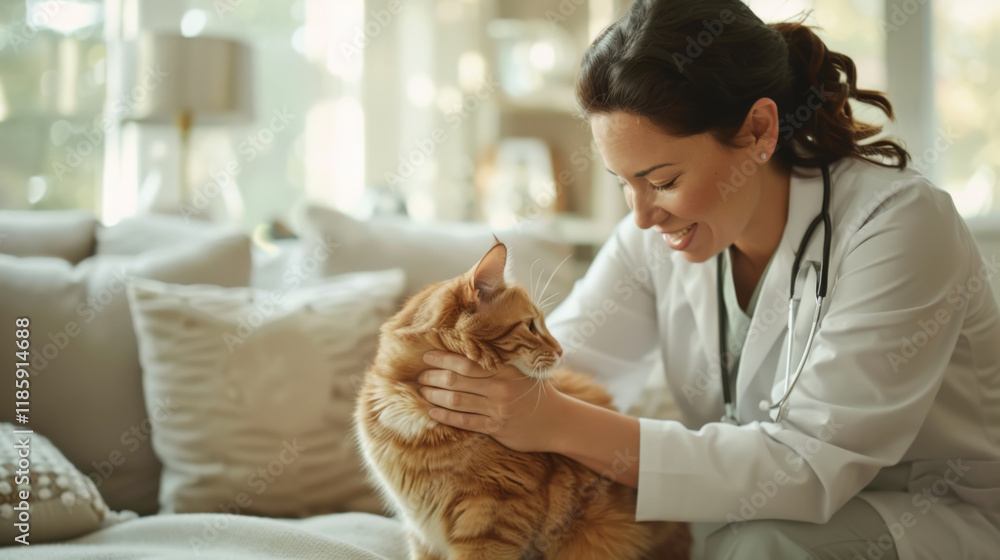 Plakat do Gabinetu Weterynaryjnego - Smiling veterinarian caring for a cat at home #1185914688