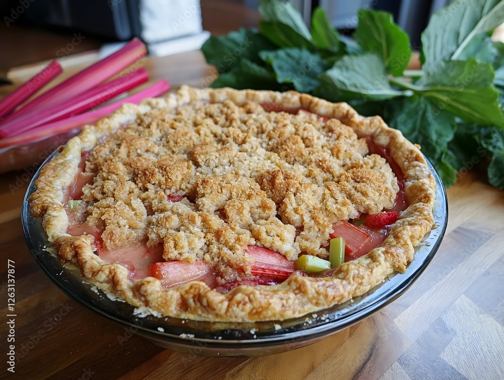 • Delicious rhubarb crumble pie with flaky crust and fresh rhubarb stalks