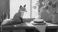 • A fox sits on a table with a cup of coffee and a pie on a plate in a painting