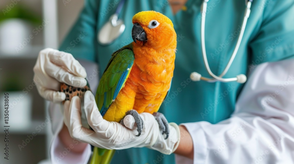 Plakat do Gabinetu Weterynaryjnego - A vet with gloves handling an exotic bird in a professional setting. #1350431805