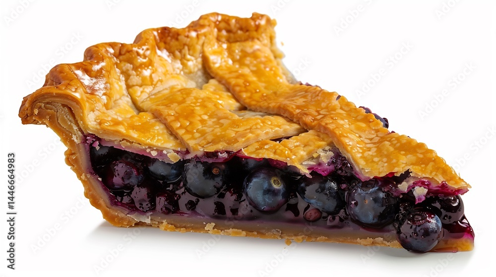 • A freshly made slice of blueberry pie with golden crust and juicy filling set against an isolated white background overlay cut out on isolated transparent removed background