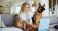 Plakat do Gabinetu Weterynaryjnego - Laptop, smile and dog with woman on sofa for pet insurance research, premium benefits and online.... #1517447958