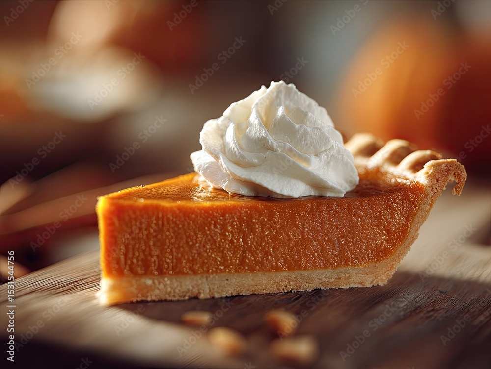 • close-up macro shot of pumpkin pie slice with whipped cream, kitchen background softly blurred, photorealistic