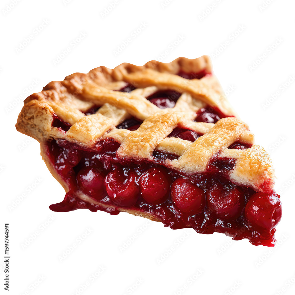 • A slice of cherry pie, showcasing a lattice-top crust and juicy filling