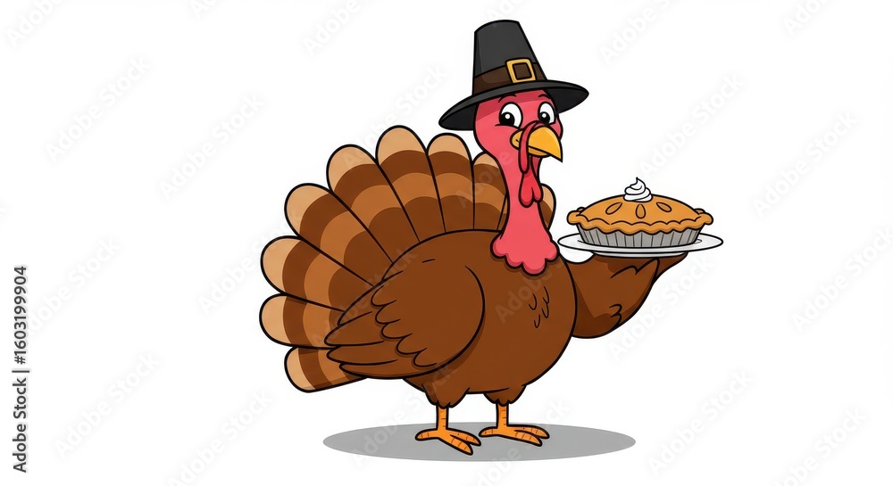 • Cartoon thanksgiving turkey wearing pilgrim hat holding pie