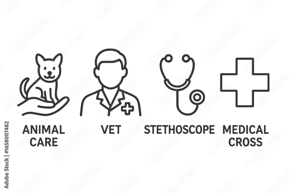 • Animal care: vet icons with stethoscope and medical cross symbols
