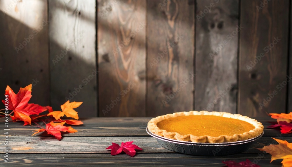 • Freshly baked pumpkin pie on table decorated with autumn fruits and leaves