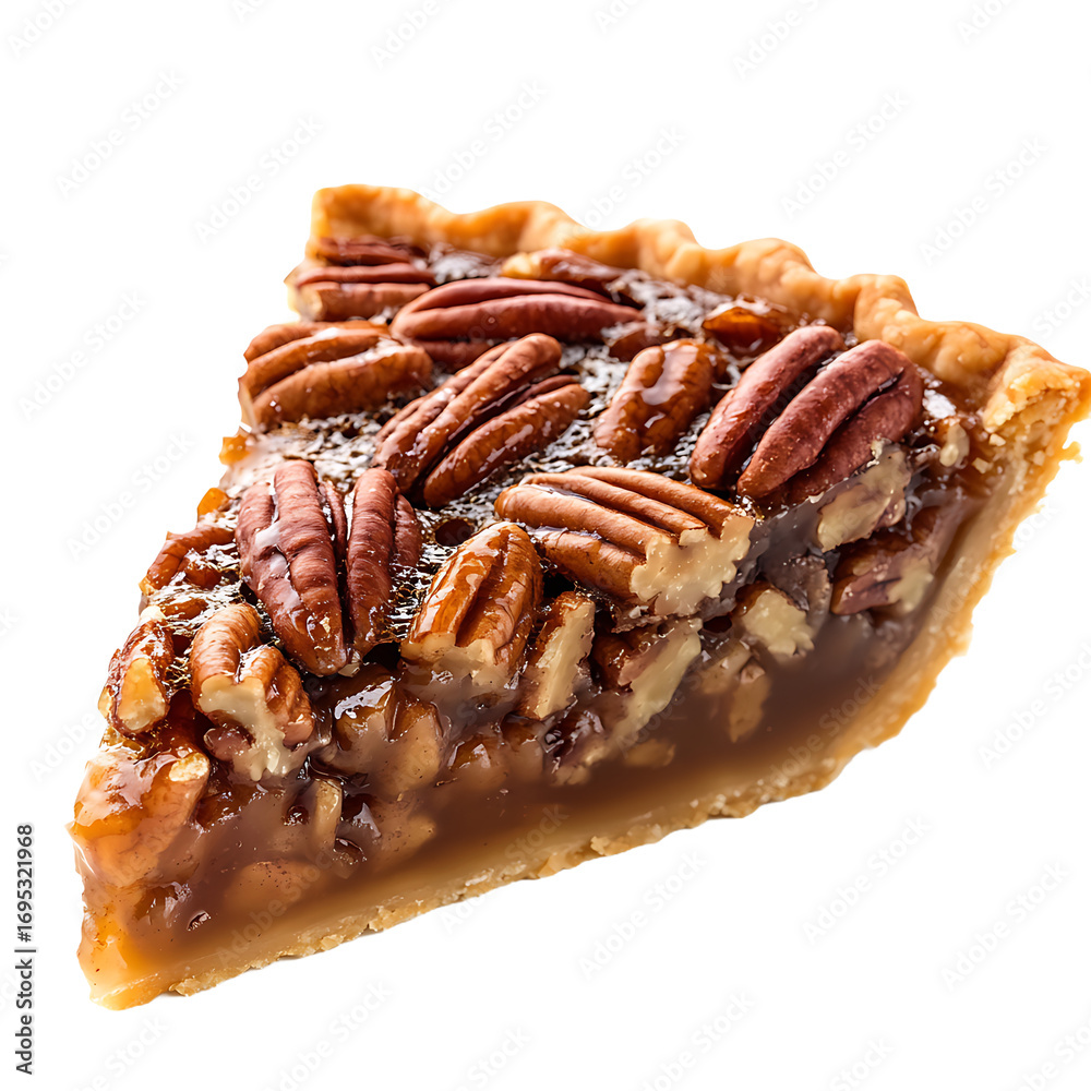 • A slice of pecan pie with a golden-brown crust and glossy caramelized topping.