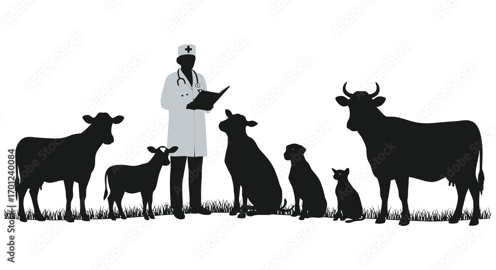 Plakat do Gabinetu Weterynaryjnego - a veterinarian examining cows and calves in silhouette #1701240084