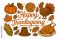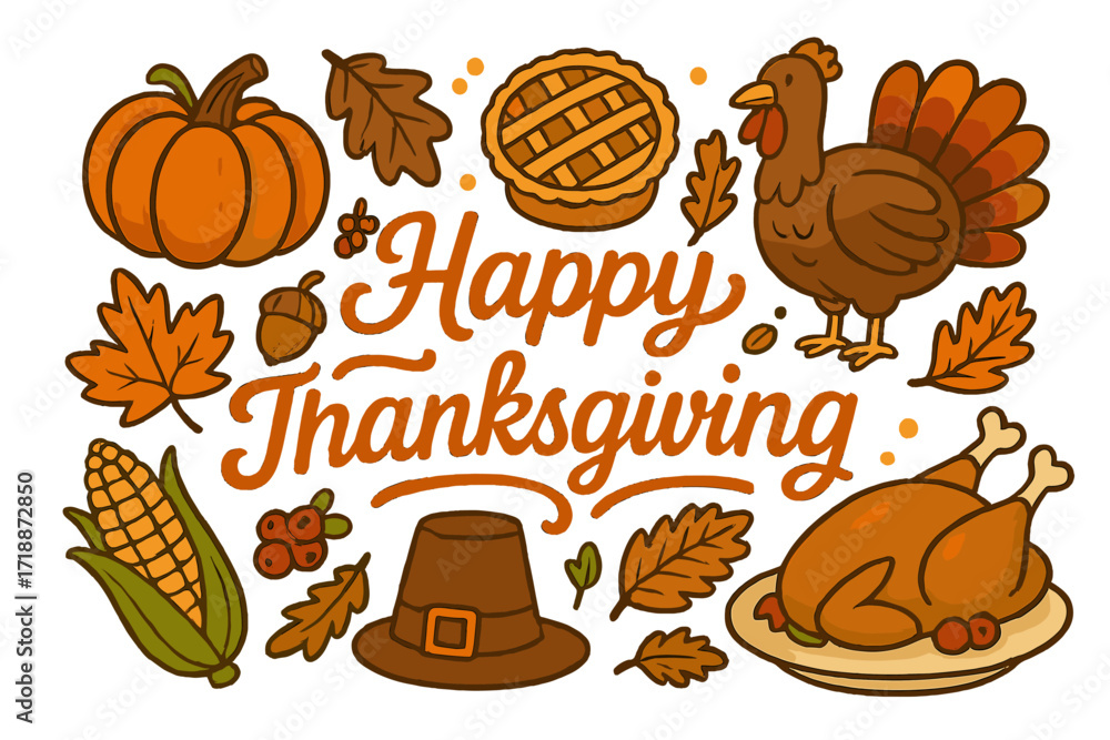 • Happy Thanksgiving lettering with cartoon icon set. Vector collection of holiday symbols: turkey, pumpkin, pie, corn, and pilgrim hat. Autumn harvest festival illustration.