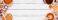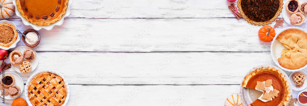 • Homemade autumn pie double border. Top view on a white wood banner background with copy space. Assortment of apple, pumpkin and pecan pies.