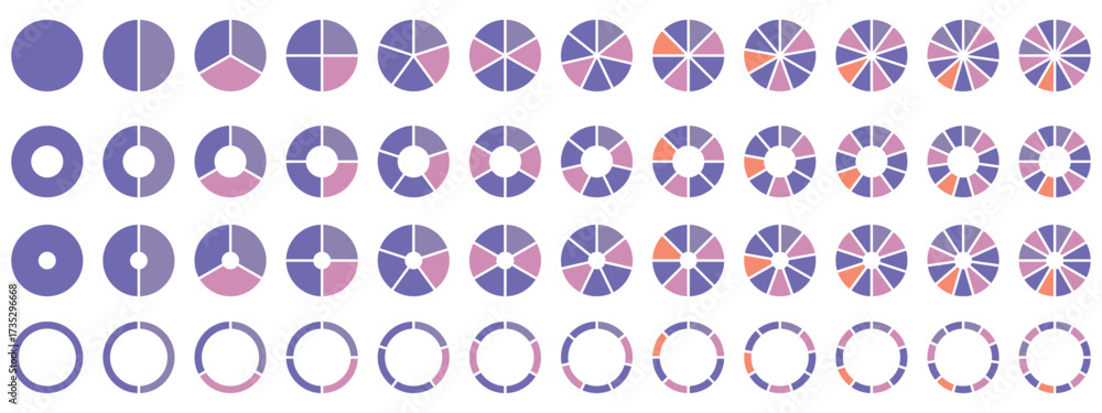 • Pie chart color icons. Segment slice sign. Circle section graph. Pie chart set. Colorful diagram collection. 2,3,4,5,6,7,8,9,10,11,12 segment infographic. Circle pie chart diagram.