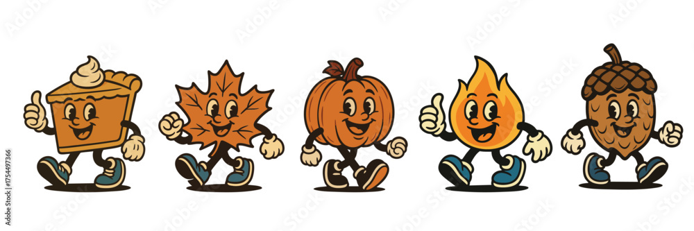 • Cute autumn retro cartoon mascot characters walking together, vintage thanksgiving illustration with pumpkin pie and leaf