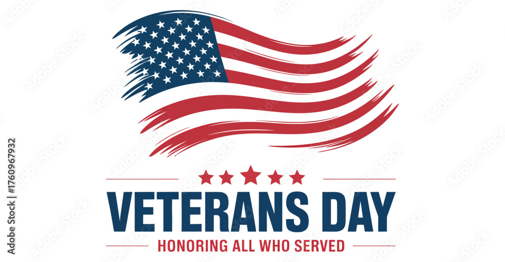• Veterans Day tribute with wavy American flag, red stars, and bold text—honoring U.S. military service with patriotic pride and gratitude