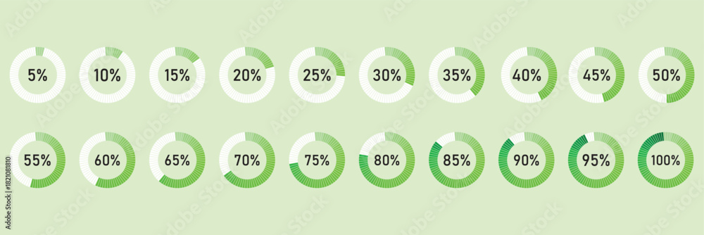 • Set of circle percentage diagrams for infographics, 0 5 10 15 20 25 30 35 40 45 50 55 60 65 70 75 80 85 90 95 100 percent. Vector illustration. Set of pie charts from 0% to 100% (5% increments). EPS10