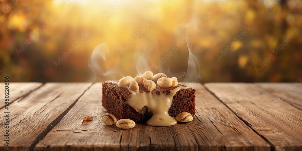 • Chocolate brownie topped with white chocolate and macadamia nuts, used as a dessert presentation, National Dessert Day