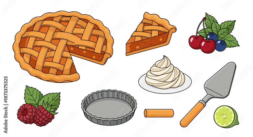 • Delicious homemade pie with fresh berries and cream illustration showcases baking ingredients for a celebratory dessert, perfect for culinary themes and food illustration projects,.